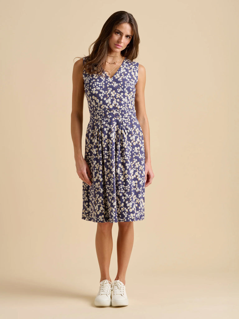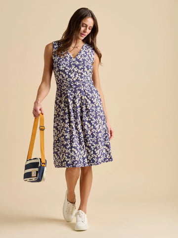 Say hello to your new summertime favourite. With a wrap bust and flattering pleats on the waistline, this dress creates a beautiful shape. Walk through botanical gardens in florals, paired with white sandals and gold accessories.