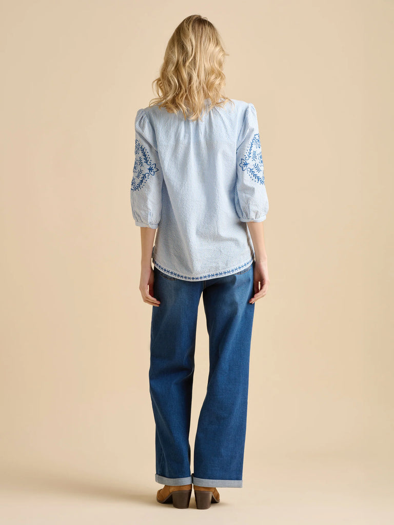 Boho meets the beach. With beautiful deep blue embroidery upon textured pinstripe, this blouse is a true stunner. Ideal for strolling along the shoreline or spending time in nature. Pair with white shorts and leather sandals.