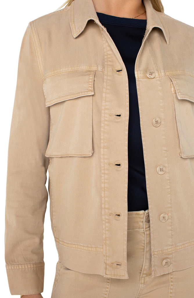Enhance your wardrobe with our button-front cargo jacket, crafted from sleek twill fabric for ultimate comfort and style. Layer the utility jacket over a basic t-shirt or lightweight knit for added texture and a relaxed look.
