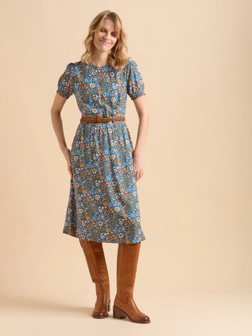 The dress is all about flattering your figure. With pleats at the waist, darts, and an elasticated back, it hugs in all the right places. The rich, warm floral fabric and puffed sleeves with shirred cuffs complete the look, making it perfect for dressing up with kitten heels.