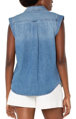 Effortlessly cool and casually chic, this sleeveless soft denim top combines timeless style with modern functionality. Featuring a classic collar and handy pockets, it’s perfect for laid-back days when you want comfort without sacrificing style.