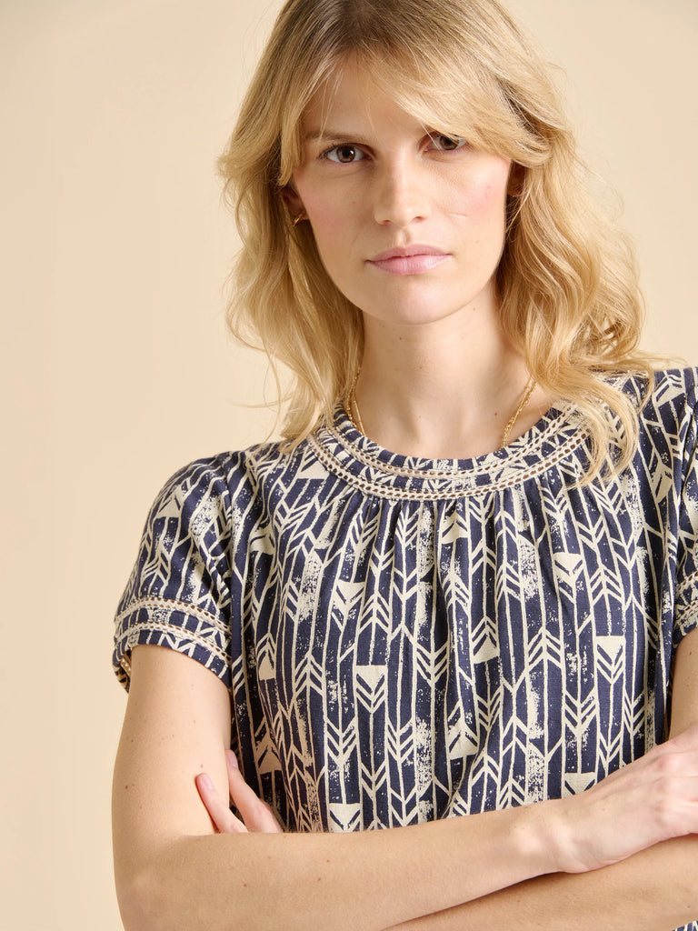 This arrow-patterned tee brings a geometric flair to your wardrobe with its unique design and feminine touches. Perfect for pairing with slacks and chunky sandals, this fitted tee transitions easily from a day on the boat to an evening out.