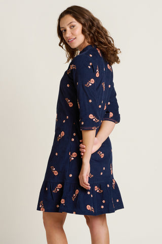 Embroidered cord dresses are perfect for autumn and winter. The Brakeburn Maeve Knee Length Shirt Dress is navy blue with red and pink floral motifs. With three quarter sleeves, pockets at the waist and a ruffle at the bottom, this is a relaxed day dress with a flattering fit. Wear with tights, boots and a slouchy cardi or white trainers for weekend adventures.